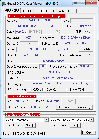 Посмотреть на первые плоды интеграции CPU и GPU вживую журналистам удалось в тот же день. По завершению презентационной части каждому из нас на несколько часов была предоставлена индивидуальная тестовая система на платформе Brazos, имеющая в своём составе Zacate APU с характеристиками процессора E-350, то есть частотой 1,6 ГГц для двух ядер CPU и 500 МГц для GPU.