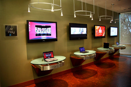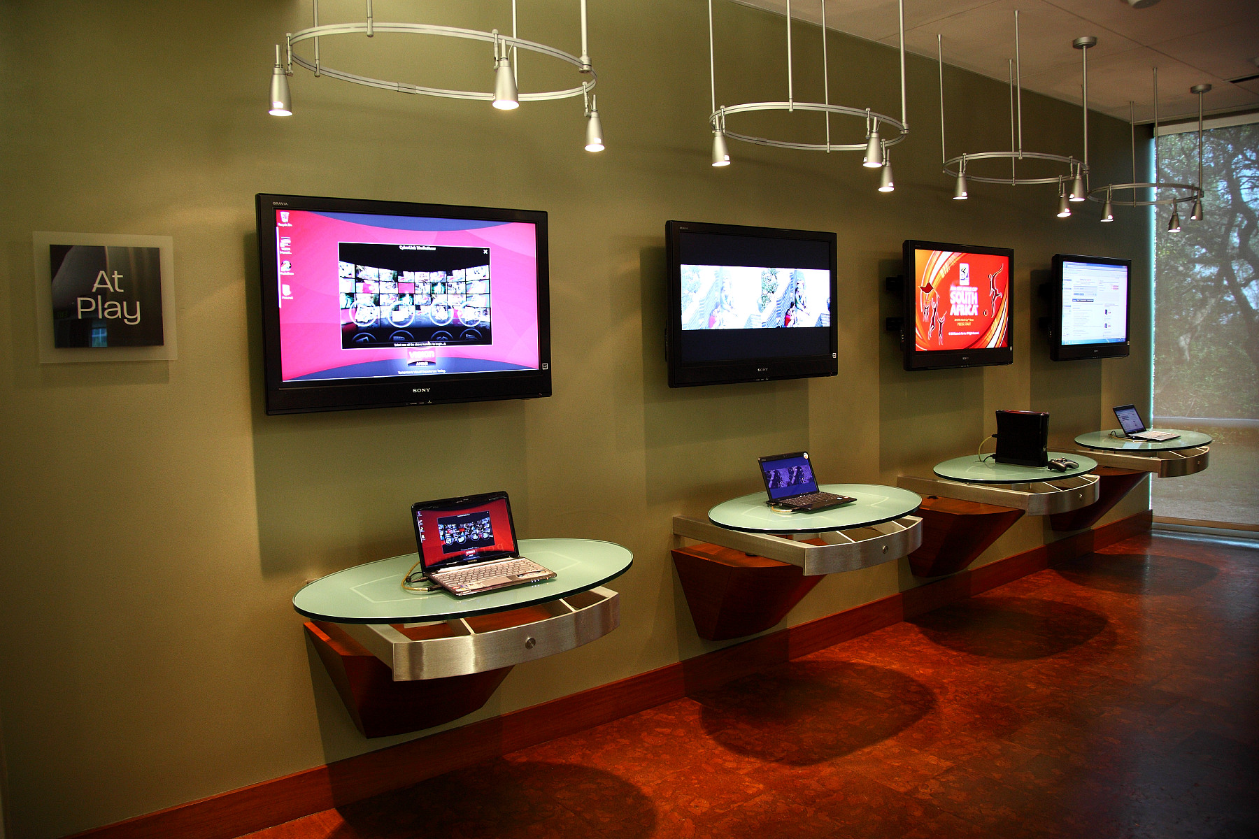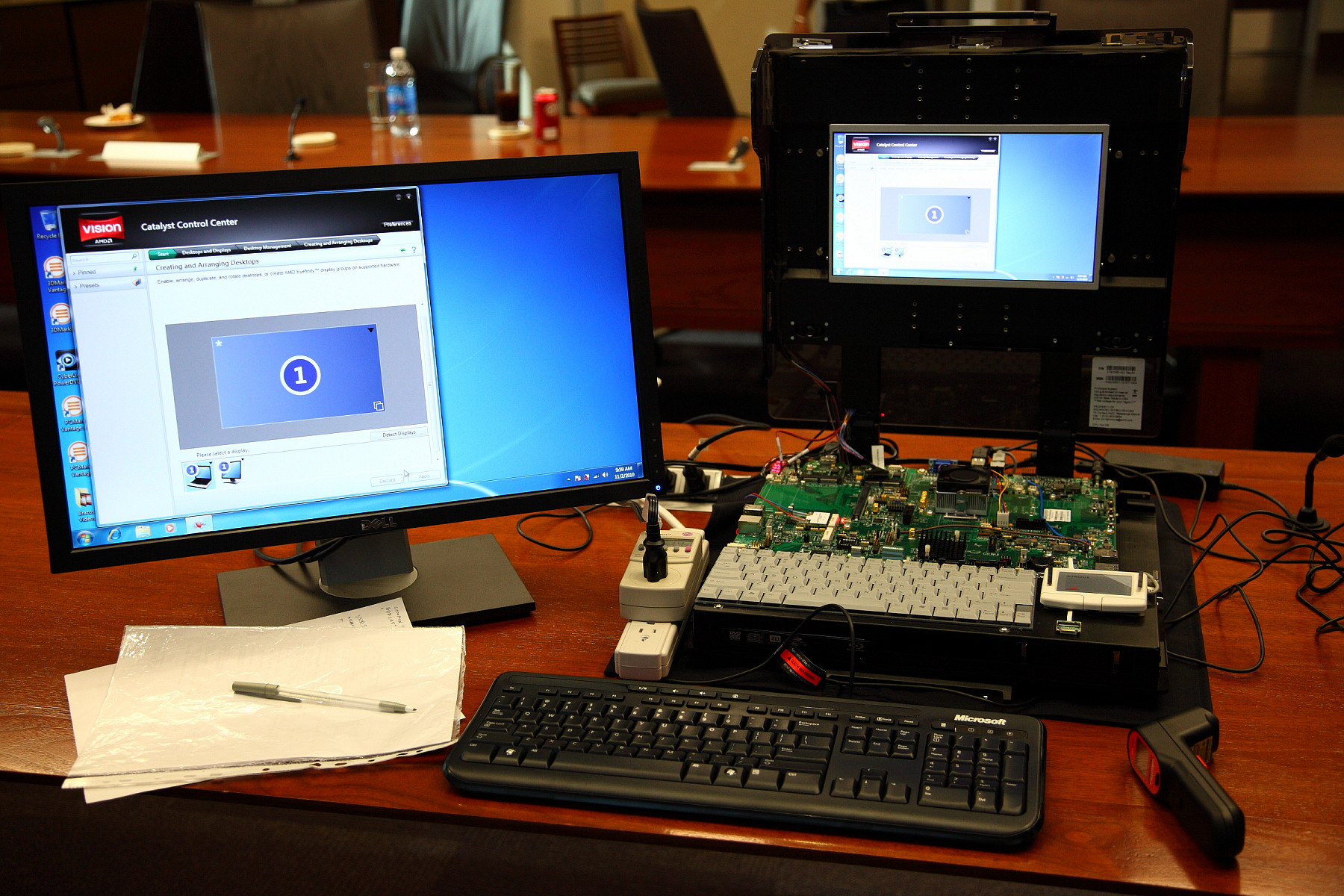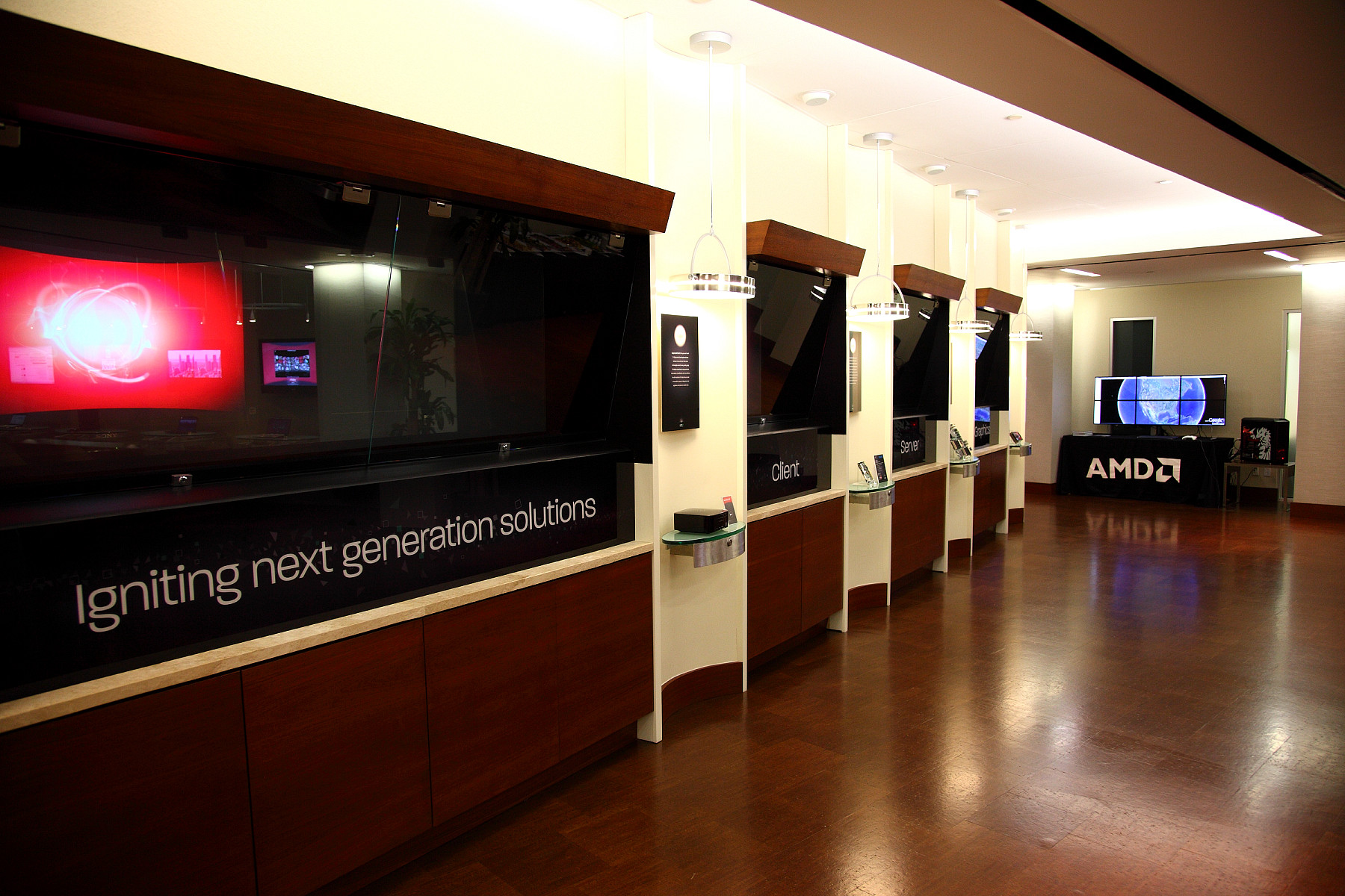 В офисе компании приглашённым на мероприятие журналистам показали несколько презентаций и рассказали о Fusion, будущих семействах APU и конкретно о платформе «Brazos», которая стала основой для первых APU. В перерывах между этапами мероприятия я походил по «гостевой» части офиса, где были расставлены многочисленные продукты, основанные на чипах производства AMD:
