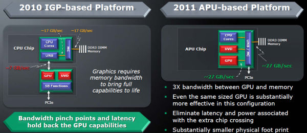 В традиционных архитектурах с отдельными CPU и GPU данные между чипами передаются по шине PCI Express. Она хоть и обеспечивает приличную пропускную способность для внешней шины, но не может сравниться с теми шинами, которые можно интегрировать в кристалл вместе с CPU и GPU. И медленный обмен между CPU и GPU сейчас зачастую приводит к тому, что на GPU невыгодно перекладывать расчёты, так как медлительность передачи данных по шине нивелирует весь прирост. А уже в нынешних APU скорость передачи данных между CPU и GPU ядрами возросла с 7-8 ГБ/с до 27 ГБ/с, вместе с этим уменьшились и задержки.