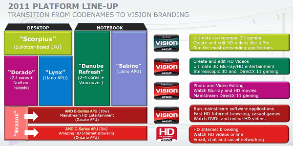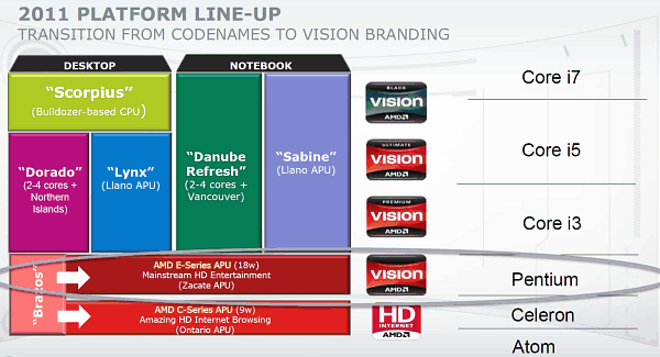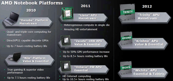 Вполне логично, что первыми на рынок выходят наименее мощные APU платформы «Brazos», предназначенные для сегмента нетбуков и недорогих ноутбуков. Они и в производстве проще, и для ультрапортативных систем низкое энергопотребление и энергоэффективность важнее всего.