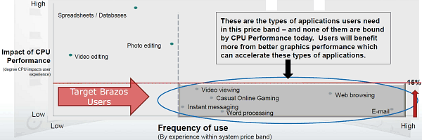 На этом графике компании AMD представлен весь круг задач, которые интересуют среднего пользователя, в зависимости от частоты использования данного ПО и его требовательности к мощности центрального процессора. Получается, что основные задачи, наиболее часто выполняемые на недорогих ПК, не требуют слишком мощного CPU. Зато некоторые из них вполне могут получить прирост производительности от более мощного ядра GPU.