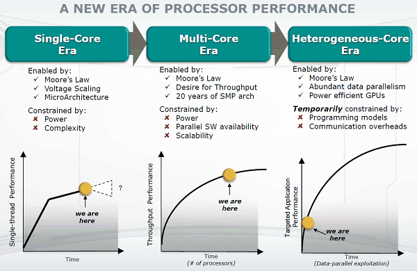 Сейчас, по мнению компании AMD, настала эра гетерогенной многоядерности, которая отличается ещё более широким распараллеливанием алгоритмов, возможности которых пока что ограничены программной моделью и необходимостью в более производительном обмене данными между ядрами разных типов. APU — это как раз попытка совместить эффективную последовательную обработку данных на CPU и параллельную — на ядрах GPU.