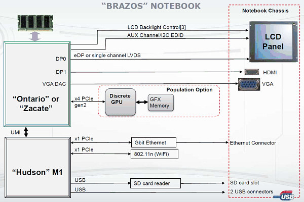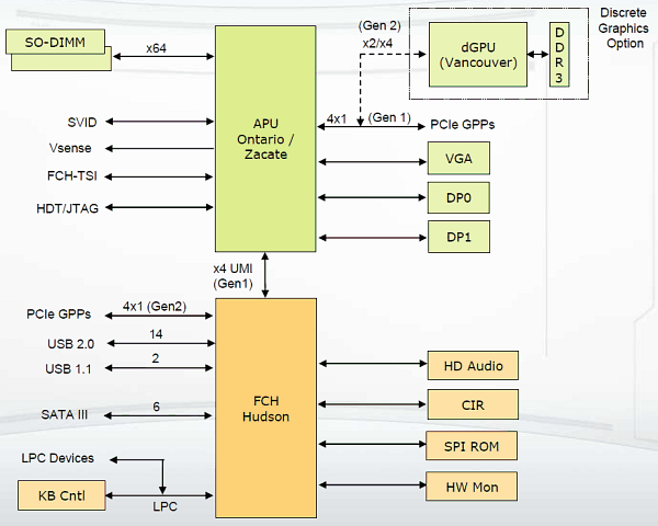 На основе платформы Brazos с Ontario/Zacate APU есть возможность создания и ноутбуков с дискретной мобильной графикой AMD следующего поколения — при этом необходимо применение GPU семейства «Vancouver». Чип дискретной графики присоединяется к APU при помощи четырёхканального линка PCI-E второй версии, а дополнительные контроллеры в таком случае будут использовать каналы PCI-E, предоставляемые чипом Hudson.