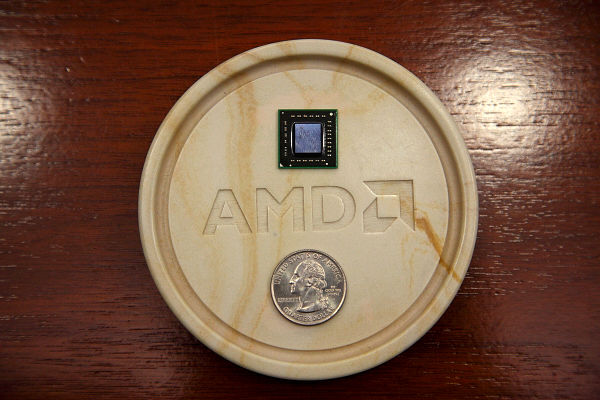 Как мы уже говорили, Zacate и Ontario основаны на идентичном кристалле, но отличаются характеристиками в виде количества активных вычислительных ядер и частотными характеристиками CPU- и GPU-частей. Как видно на фотографии, это единый кристалл очень малого размера (25-центовая монета диаметром почти как наша двухрублёвая), на котором уместились и ядра CPU и пара SIMD-блоков GPU.