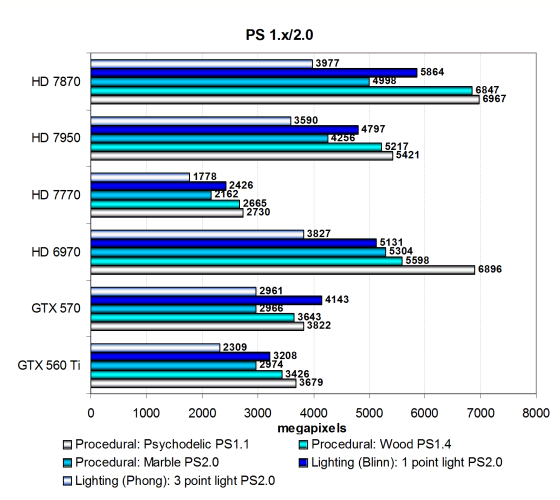 По сравнению с конкурирующими моделями Nvidia Geforce, новинка AMD явно быстрее обоих решений, и GTX 570 и GTX 560 Ti, которые показали близкую скорость. Посмотрим на результаты более сложных пиксельных программ промежуточных версий: