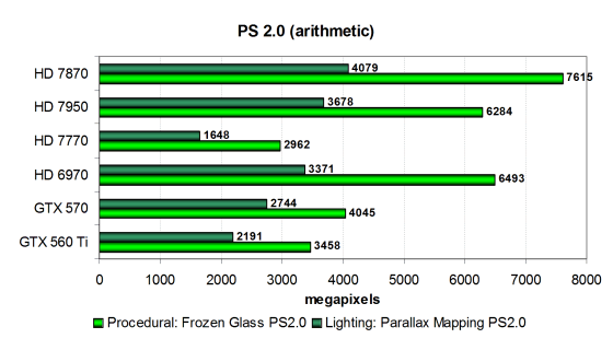 Увы, но в данном случае тест измеряет скорее пропускную способность памяти, чем производительность ROP, и поэтому Radeon HD 7870 уступает не только HD 7950, но и HD 6970 — в полном соответствии с теорией. И новая модель компании AMD в этом сравнении показала результат, сравнимый со скоростью GTX 570, что подтверждает теорию об ограничении скорости ПСП.