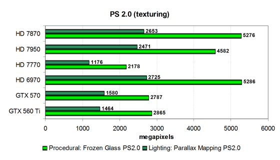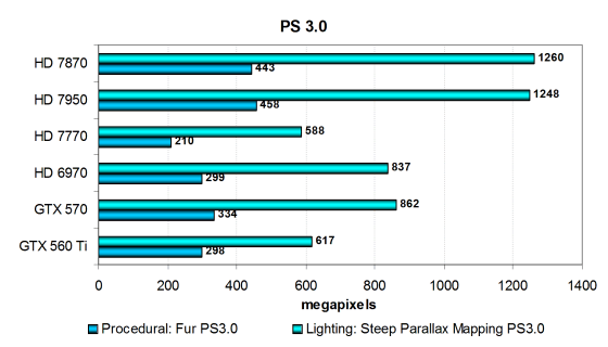 Во втором, больше зависящем от скорости текстурирования, тесте процедурной визуализации воды «Water» используется зависимая выборка из текстур больших уровней вложенности, и поэтому видеокарты в нём располагаются по скорости текстурирования, с поправкой на разную эффективность использования TMU. И в этом тесте решения компании AMD имеют преимущество перед Geforce, в этот раз ещё больше опережая их. А новый HD 7870 немного уступает младшей модели из топовой серии, что соответствует теории.