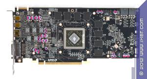 Мы не зря сравнили HD 7870 и HD 6970: обе карты имеют PCB с 256-битной шиной, да и чипы соразмерные по производительности. Однако схожесть, по сути, осталась только в размещении микросхем памяти вокруг ядра. Все остальное существенно переделано: во-первых, блок питания несколько упрощен, да и перенесен поближе к выводным гнездам. Во-вторых, уменьшилась длина печатной платы, в-третьих, из-за более тонкого техпроцесса ядра продукт суммарно потребляет меньше, поэтому стало возможным ограничиться установкой двух 6-контактных разъемов дополнительного питания, а не 8+6, как у HD 6970. Да и само ядро уменьшилось по площади.
