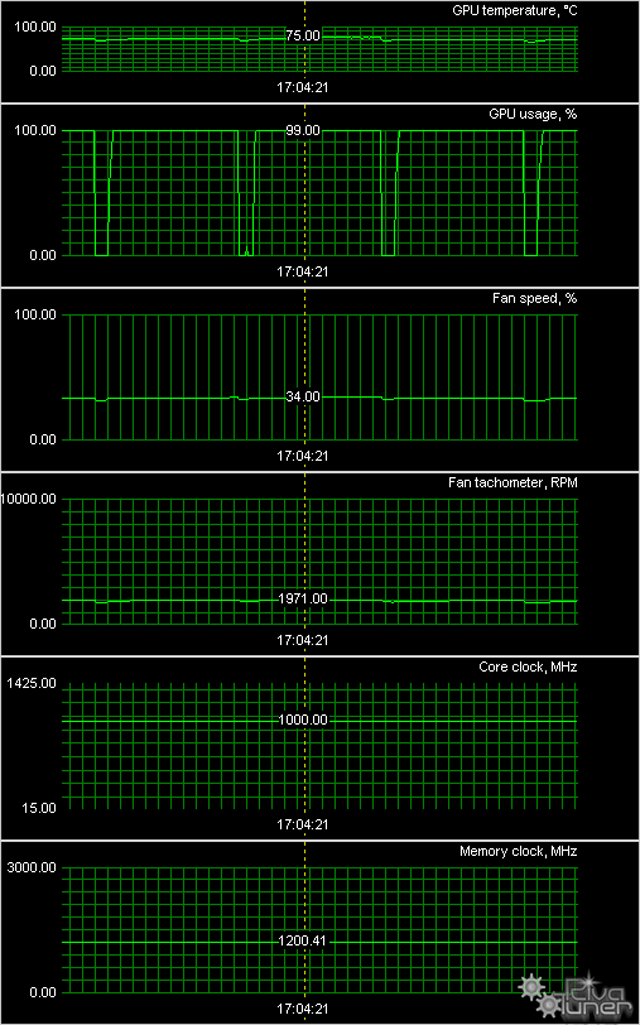 Во-первых, надо сразу отметить, что ускоритель разгоняется просто шикарно! Мы получили прирост по частоте ядра в 150 МГц! И при этом максимальная температура на ядре поднялась всего на пару градусов. Во-вторых, мы видим, что в целом нагрев не выше 80 градусов, что для такого рода ускорителей более чем хорошо. В-третьих, замечаем, что обороты кулера после 6 часов под нагрузкой особо не выросли. СО — отличная!