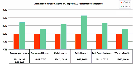 Компания AMD приводит такие данные для RADEON HD 3850 с 256 мегабайтами памяти: разница в производительности между системами с PCI Express 1.x и 2.0 в играх Company of Heroes, Call of Juarez, Lost Planet и World In Conflict меняется от 5% до 25%, в среднем составляя около 10%. Естественно, в высоких разрешениях, когда буфер кадра и сопутствующие буферы занимают большую часть локальной видеопамяти, а некоторые ресурсы хранятся в системной.