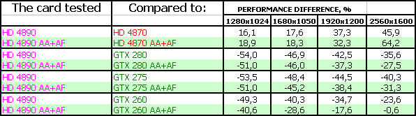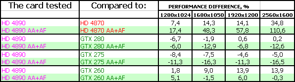 Хочу заметить, что видеокарта от HIS (которая попала к нам от AMD), имела частоту ядра не 850, а 900 МГц, однако мы справедливо решили, что раз это референс-продукт, а не разогнанная версия, то мы должны использовать штатные, номинальные частоты для исследования, и потому все вышеприведенные тесты были сняты на 4890, работащем на стандартных частотах 850/975 МГц. Тот случай с 900 МГц по ядру будем считать единичным и некоей ошибкой. И ждем от вендоров уже серийных карт серий Turbo или т.п. с повышенными частотами, (впрочем, как и GTX 275 тоже).