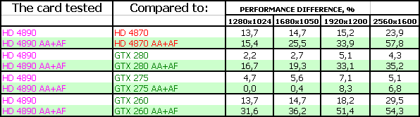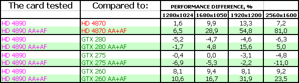 Теперь по существу. Очевидно, что RADEON HD 4890 существенно усилил линейку продуктов 4ххх от AMD, позволив уже вплотную приблизиться к однопроцессорному флагману от Nvidia — Geforce GTX 285 (с которым вообще-то призван соперничать 4870 X2). Также очевидно, что бывший вполне успешный соперник HD 4870 — Geforce GTX 260 уже в данном случае безнадежно отстал от новинки.