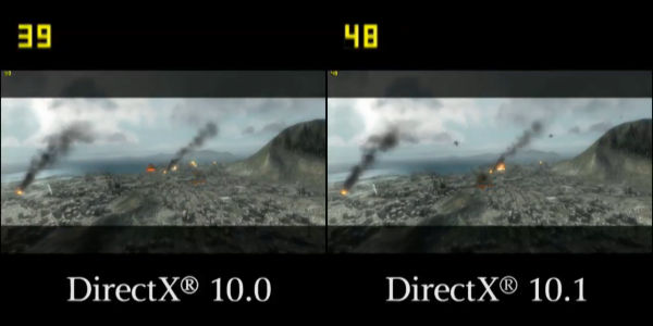 Но Clear Sky это не такая уж новая игра, а ведь в последнее время вышли несколько совсем свежих игровых приложений с поддержкой DirectX 10.1, выпущенных при содействии компании AMD. Одной из таких игр является довольно популярная Tom Clancy's H.A.W.X. от Ubisoft. По 3D графике она отличается тем, что в ней применены качественные алгоритмы Screen Space Ambient Occlusion (SSAO) и гауссово размытие карт теней. Оба этих алгоритма хоть и не требуют обязательного использования возможностей DX10.1, но получают значительное ускорение от некоторых возможностей API этой версии. Так, по встроенному бенчмарку в разрешении 1920х1080, ускорение от перехода на DX 10.1 достигает 20%. На изображении ниже показаны кадры из бенчмарка с цифрами мгновенного FPS: