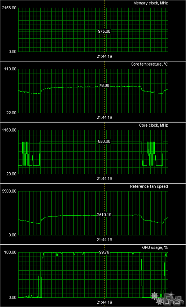 Мы провели исследование температурного режима с помощью утилиты RivaTuner (автор А.Николайчук AKA Unwinder) и получили следующие результаты (поскольку все карты работают на одинаковых частотах и представляют собой просто копии одной и той же платы, то приведем общий результат):