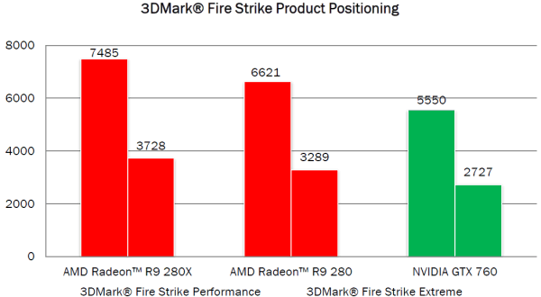Теоретически, с производительностью нового решения AMD все понятно — Radeon R9 280 по всем скоростным характеристикам должна быть идентична Radeon HD 7950 Boost, судя по очень близким спецификациям. А от старшей R9 280X на базе полноценного чипа Tahiti новинка должна отставать примерно на 15%. Посмотрим на предварительные показатели производительности новой платы компании AMD относительно старшей модели и решения конкурента в реальных приложениях. Для начала возьмем популярный пакет тестов 3DMark и столь любимый компанией тест FireStrike — в нем решения Radeon всегда выглядят очень впечатляюще: