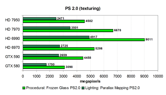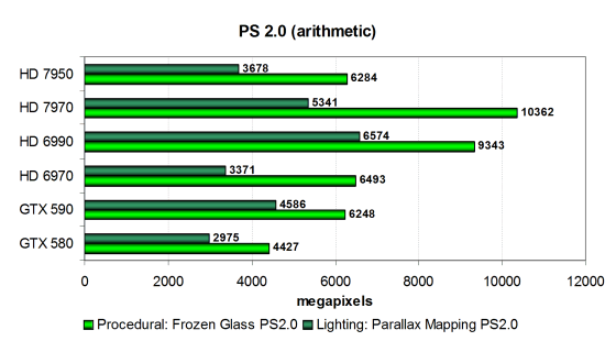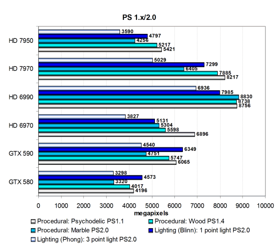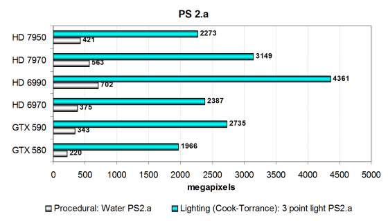 Производительность в тестах ограничена в основном скоростью текстурных модулей и филлрейтом, и поэтому платы AMD в целом опережают конкурирующие модели Nvidia Geforce. В неудачах Nvidia в этих тестах виноват недостаток скорости текстурирования. А вот пиксельный шейдер освещения с тремя источниками по Фонгу, больше зависящий от математической производительности GPU, на Radeon HD 7950 и Geforce GTX 580 выполняется со схожей скоростью.