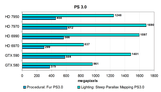 Скорость в обоих тестах PS 3.0 слабо зависит от ПСП и текстурирования, зато код отличается высокой сложностью, с чем очень неплохо справляется и имеющаяся архитектура Nvidia и новейшая скалярная архитектура компании AMD. Ранее решения Nvidia были неоспоримыми лидерами в этой паре тестов, но видеокарты на базе Tahiti смогли их опередить.