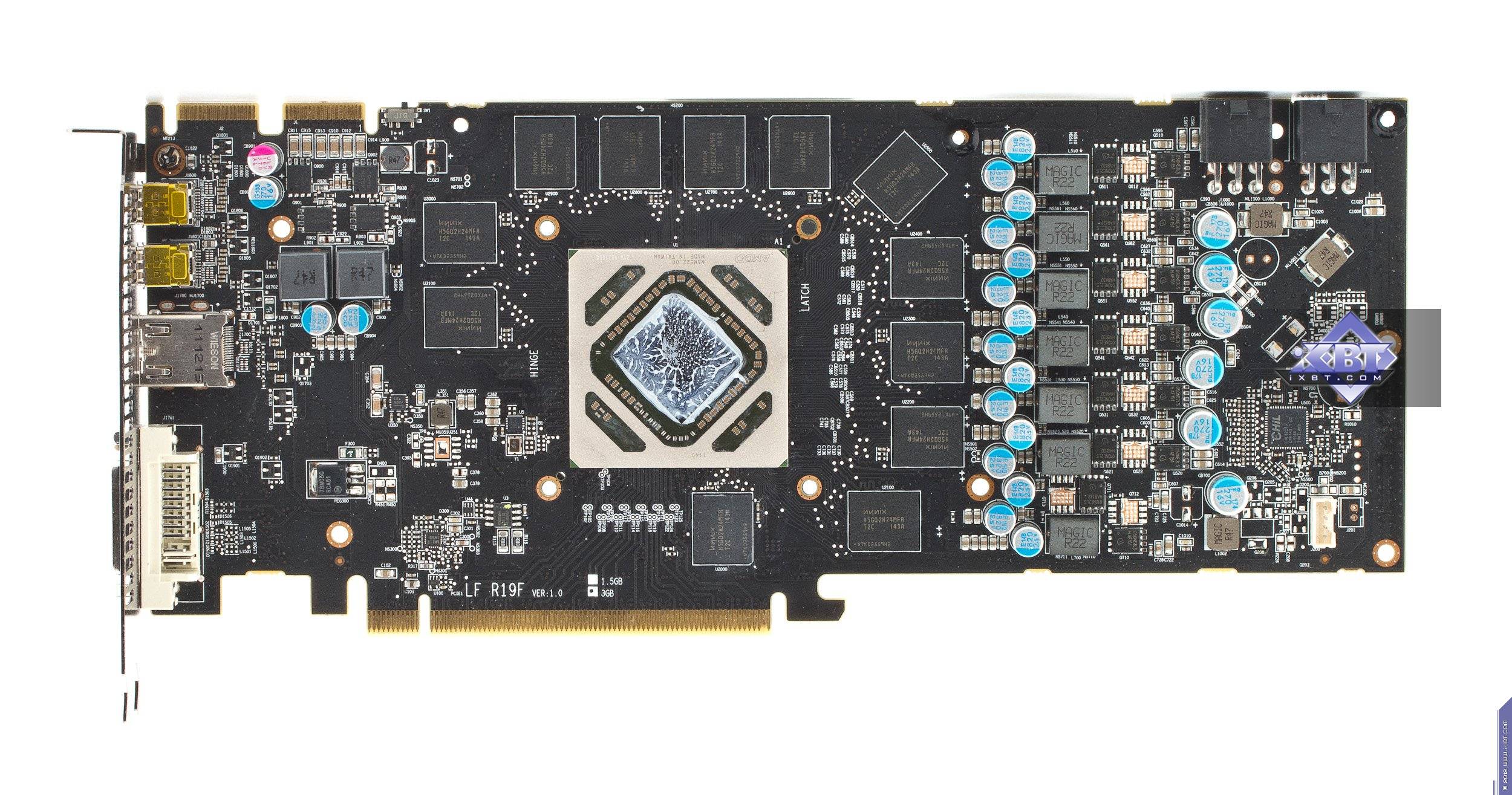 PCB у HD 7950 по сути повторяет собой печатную плату старшего собрата HD 7970, что и ожидалось, поскольку физически ядро (как кристалл или чип) то же, да и шина обмена с памятью не изменилась.
