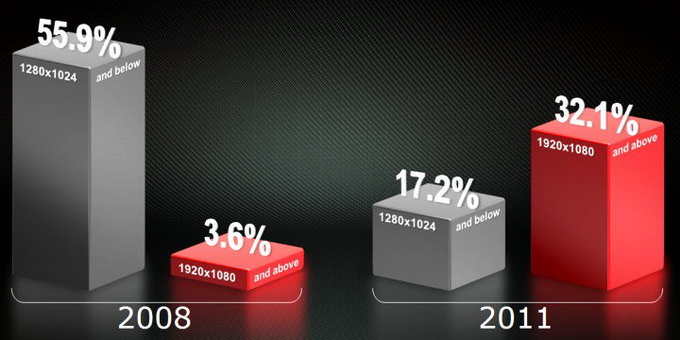 Но самое интересное даже не в размере и разрешении экрана. Если в 2008 году цена такого дисплея была порядка $360, то цены 24″ моделей в нынешнем году начинаются от $170-180. То есть, покупатель теперь получает чуть больший физически экран, имеющий почти на 20% больше пикселей, меньше чем за половину цены трёхгодичной давности для гораздо худшего монитора. Именно поэтому устройства с FullHD-разрешением уже стали наиболее распространёнными на рынке — ведь они стоят совсем недорого.
