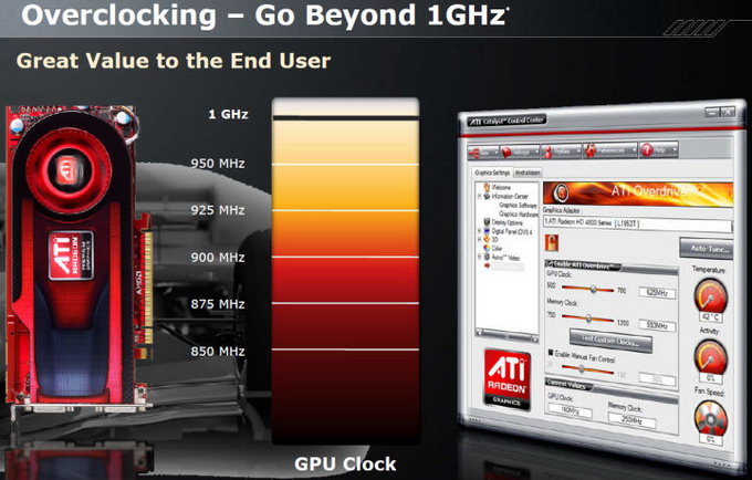 Как видите, практически обещается разгон до частоты 1 ГГц и выше, если не учитывать мелкой надписи (она не вошла в кадр, но существует) о том, что гарантия перестаёт действовать даже в том случае, если видеокарта вышла из строя в результате эксперимента с поднятием частоты из настроек видеодрайвера. Кстати, новый слайд интересно сравнить со страницей из презентации давно ушедшего с рынка Radeon HD 4890: