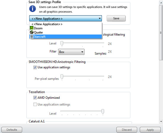 Чтобы статья была максимально полной, упомянем и основное нововведение AMD Catalyst 12.1 — пользовательские профили для 3D-приложений, позволяющие изменять базовые настройки качества и установки CrossFire отдельно для каждой программы (наконец-то AMD догнала конкурентов):