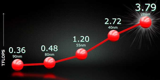 Как видите, скачки пиковой скорости при каждом новом технологическом процессе достигаются весьма значительные. Нужно ещё учесть, что техпроцесс 28 нм только начал свой путь, и можно с уверенностью сказать, что в будущем цифра в 3,79 терафлопа значительно подрастёт.