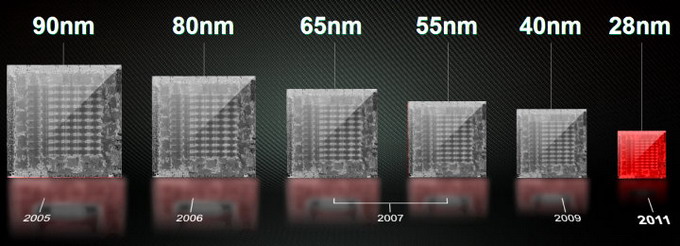 К слову о техпроцессах — именно компания AMD является их первопроходцем на рынке графических процессоров. В последние несколько лет эта компания опережала своего единственного сильного конкурента — Nvidia — по внедрению всех новых техпроцессов. Вот и сейчас они первые успели анонсировать свой новый продукт ещё в уходящем 2011 году (фотографии кристаллов схематичны, к сожалению):