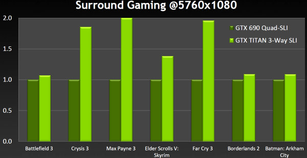 В данной теоретической части статьи мы приводим только собственные данные тестов самой компании Nvidia. Понятно, что Geforce GTX Titan должен стать быстрейшим одночиповым решением на рынке видеокарт, но насколько он быстрее? Подробные тесты будут далее, а мы приведем оценку Nvidia, которая утверждает, что три видеокарты Geforce GTX Titan — единственная возможность поиграть в одну из самых современных игр Crysis 3 с максимальными настройками на трех дисплеях в итоговом разрешении 5760×1080, да еще с применением полноэкранного сглаживания методом мультисэмплинга MSAA 2x. В таком режиме три карты обеспечили 46 FPS.
