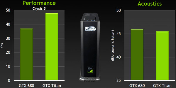 Теперь же в такие системы можно установить и Geforce GTX Titan, обладающий производительностью, близкой к Geforce GTX 690, но имеющий остальные указанные параметры, близкие к GTX 680. Такая видеокарта вполне помещается в SFF-системы и обеспечивает рост производительности по сравнению с GTX 680, оставаясь при этом даже немного более тихой!