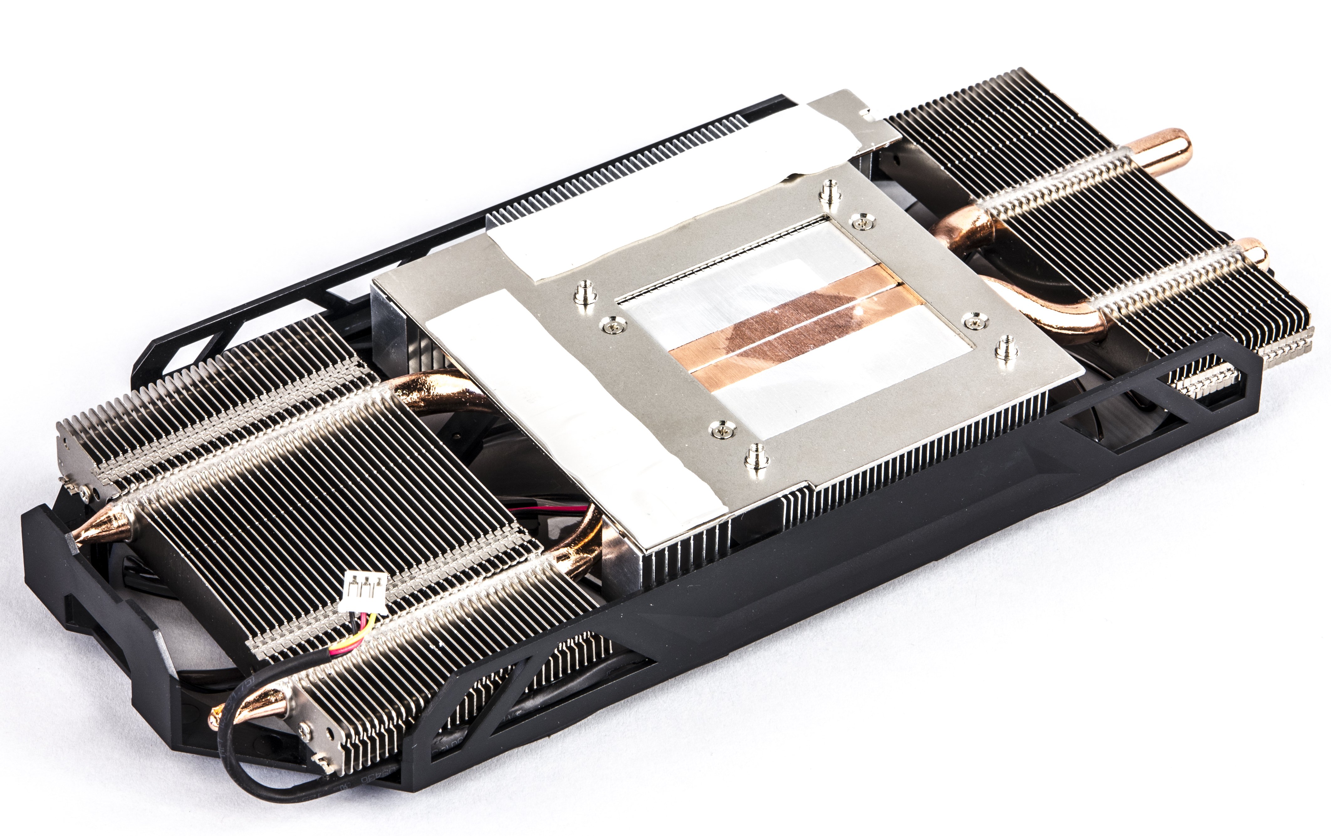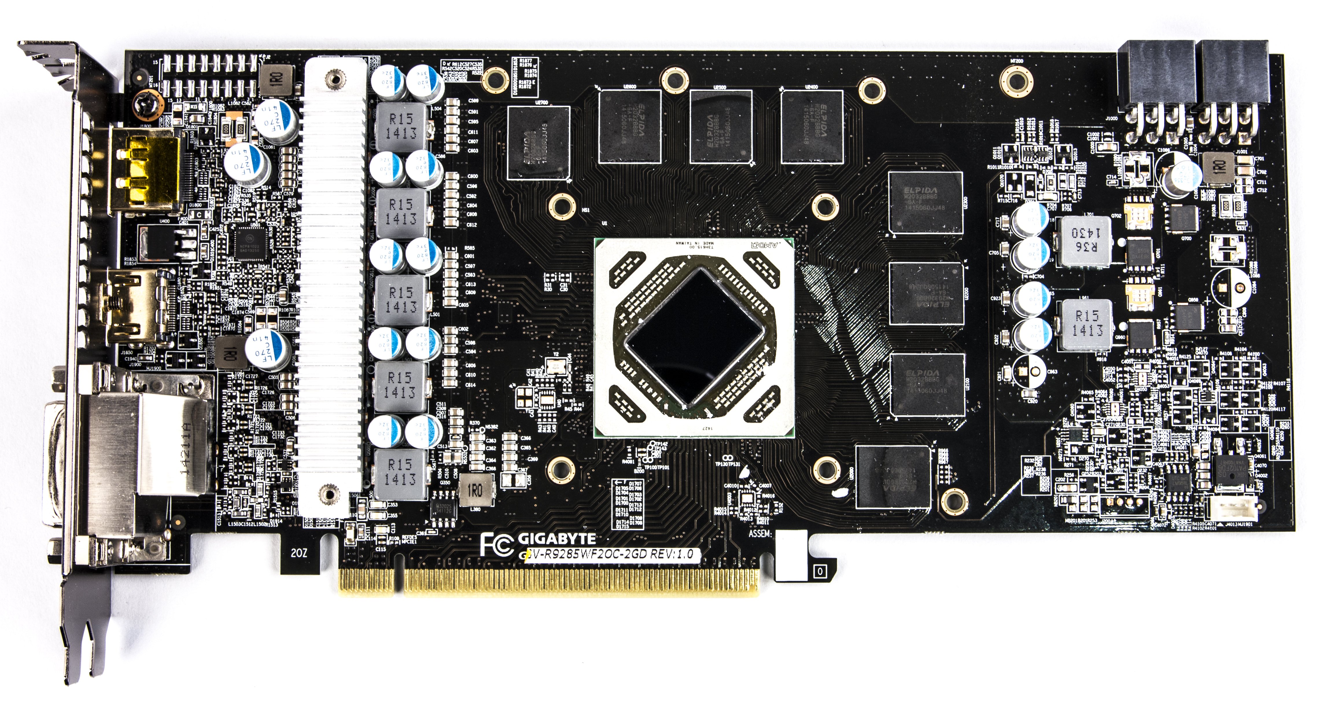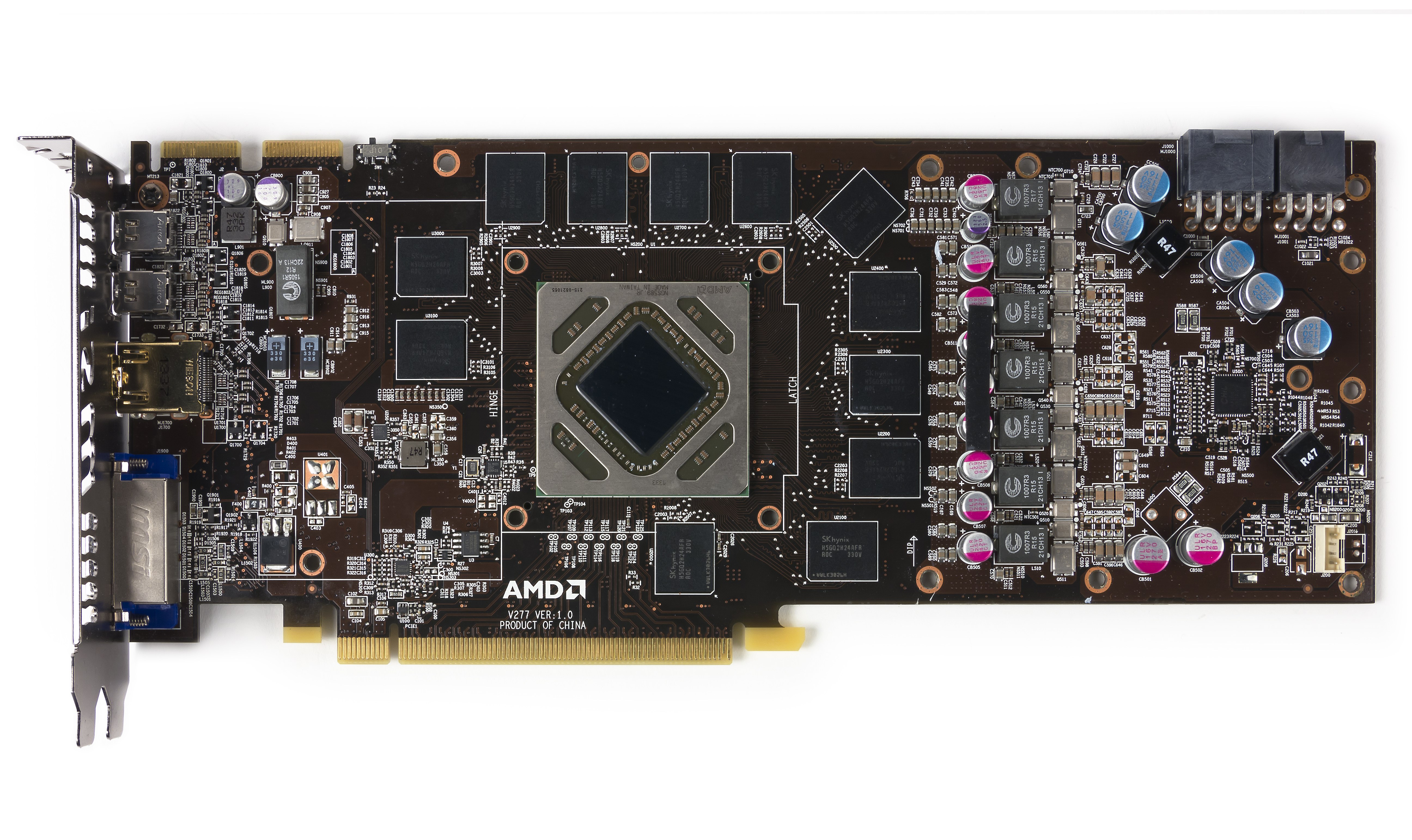 Схема питания 5-фазная для ядра и 2-фазная для микросхем памяти, управляется цифровым контроллером. Набор гнезд вывода картинки также изменился со времен Radeon HD 7970/R9 280. Наличие двух видеовыходов DP (как было у R9 280) посчитали лишним, поэтому вернули второе гнездо DVI (на 280 было одно), и теперь ускоритель может выводить картинку на приемники со всеми популярными ныне интерфейсами (причем в полноформатном виде, переходники с мини-форматов не требуются).