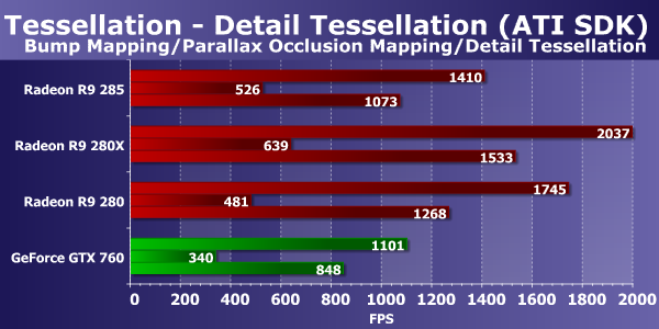 Во втором подтесте со сложными попиксельными расчетами новинка уже на 9% быстрее Radeon R9 280, хотя отставание от старшей модели на Tahiti осталось. А вот преимущество над Geforce GTX 760 лишь увеличилось, ведь эффективность выполнения таких математических вычислений в пиксельных шейдерах у чипов архитектуры GCN заметно выше, чем у Kepler.