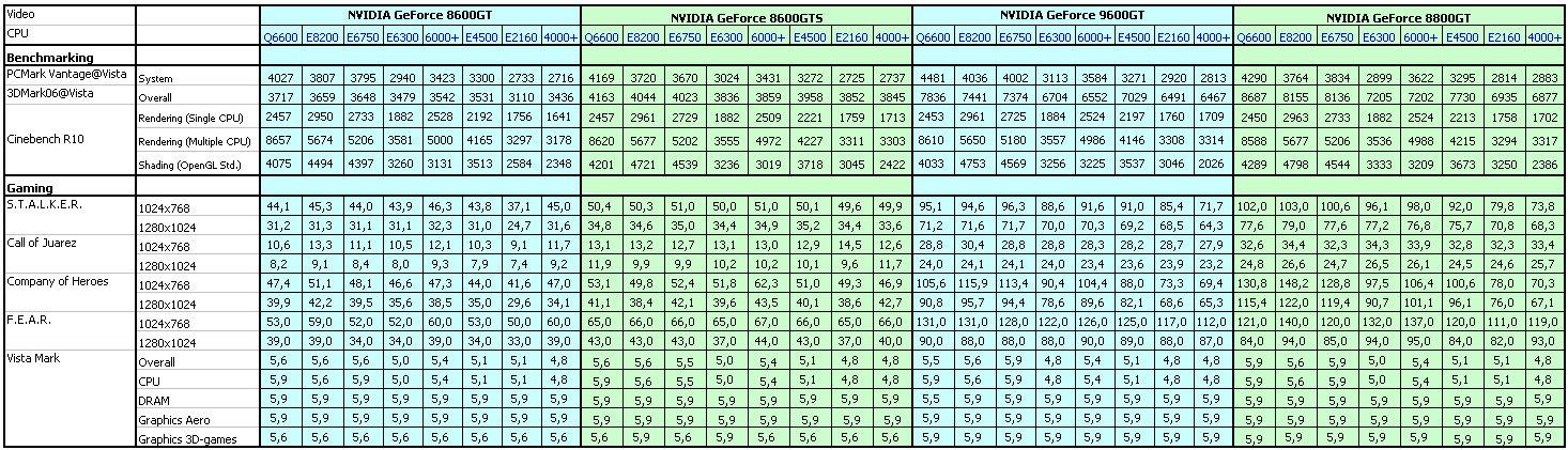 Встроенный в Windows Vista тест оказался весьма отзывчив к смене видеокарты, тогда как все процессоры получили оценку в диапазоне 4,8-5,9. Впрочем, 8600 GTS получает максимальную оценку в обоих тестах (Game и Aero), а наиболее заметный эффект наблюдается в случаях с самыми дешевыми картами (замена Geforce 8400 GS на Geforce 8500 GT и, в свою очередь, Geforce 8500 GT на Geforce 8600 GT).