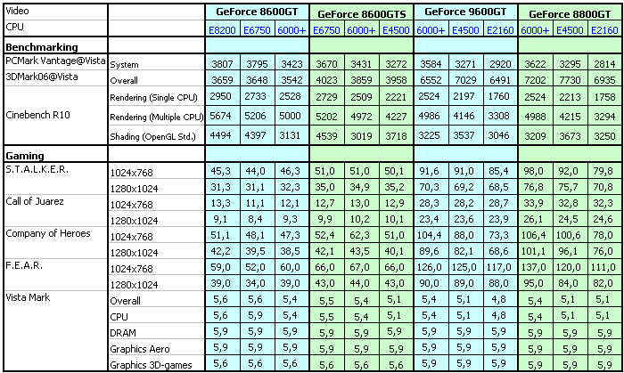 Оценка напрямую зависит от производительности графического процессора, соответственно, компьютер с более мощной картой получает более высокий общий балл, и, как можно убедиться, для видеокарт на процессорах до Geforce 8600 GTS включительно, результат более мощной карты в сочетании с самым слабым процессором оказывается выше, чем находящейся на ступеньку ниже в сочетании с самым мощным процессором. Сравнивая результаты Geforce 9600 GT и 8800 GT, впрочем, столь показательной зависимости мы не видим, поскольку эти карты весьма близки по производительности (не более 10% по результатам 3DMark06), при этом замена младшего на старший процессор дает прирост в 20—25% для обеих карт. Это объясняет, почему для установки рекордов в 3DMark (что превратилось в своего рода спорт), энтузиасты не только ставят самые мощные видеокарты, но и усиливают до предела платформу. Впрочем, эти забавы далеки от задачи получения эффективной, но недорогой, игровой конфигурации.