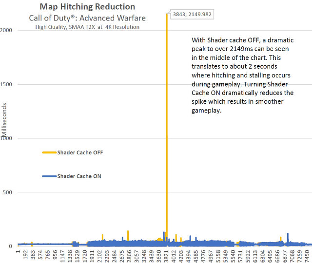 Как вы видите в середине графика, с отключенным кэшированием шейдеров в игре Call of Duty: Advanced Warfare (настройки High Quality, включено сглаживание SMAA T2X при 4K-разрешении) на конфигурации из пары видеокарт Radeon R9 390X в режиме CrossFire хорошо заметен момент компиляции шейдера при отключенном кэшировании. Значение 2149 мс для рендеринга кадра означает весьма ощутимые «тормоза» в игровом процессе — более двух секунд на экране был показан один кадр, и действия игрока всё это время никак на нём не отображаются. Включение кэша шейдеров приводит к тому, что пик падения скорости рендеринга значительно уменьшается, и в результате пользователь видит сравнительно плавный видеоряд.