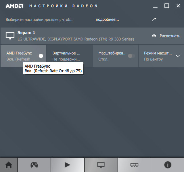 Эта панель настроек предназначена для конфигурирования дисплеев. В данном случае к тестовой системе подключён монитор LG с поддержкой технологии FreeSync, и очень удобной нам показалась индикация частот, в пределах которых будет работать данная технология: от 48 до 75 Гц. Выбор настроек не слишком богат, все остальные вы также можете найти в дополнительном меню.