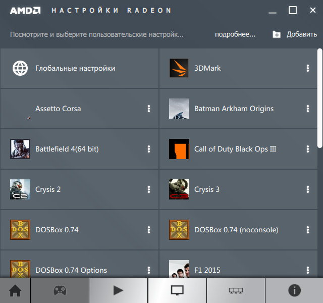 С одной стороны — довольно удобно сделаны профили для игр и изменение их настроек, с другой — игры никак не каталогизированы, все они лежат в одном списке-свалке, что не слишком то удобно. Глобальные настройки и настройки для конкретных игр примерно одинаковы и по функциональности мало отличаются от прежних: