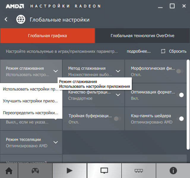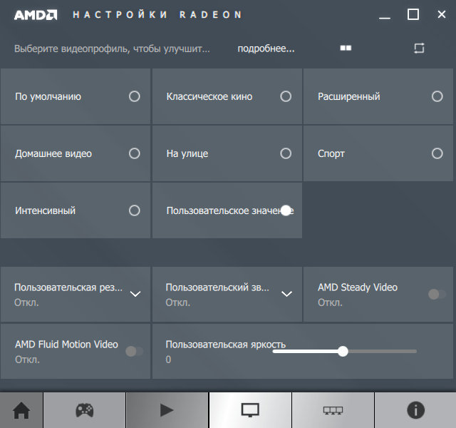 Следующая панель предназначена для настройки вывода видеоданных — можно как выбрать предустановленный профиль из нескольких, настроенных в AMD, так и настроить свои собственные пользовательские настройки, включив все технологии улучшения качества так, как нужно. Напомним, что некоторые настройки остались в дополнительном меню, вызываемом отдельно (см.выше).