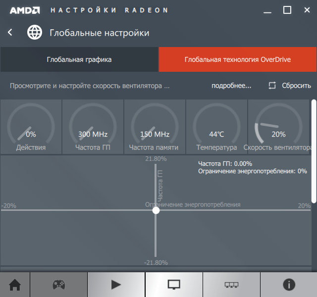 Тут же рядом настраиваются и возможности разгона, привычные по набору настроек, но в новом интерфейсе. На этой панели можно посмотреть текущие частоты, температуру, скорость вентилятора, а также изменить целевые частоты, потребление энергии и скорость вентилятора — всё как обычно.