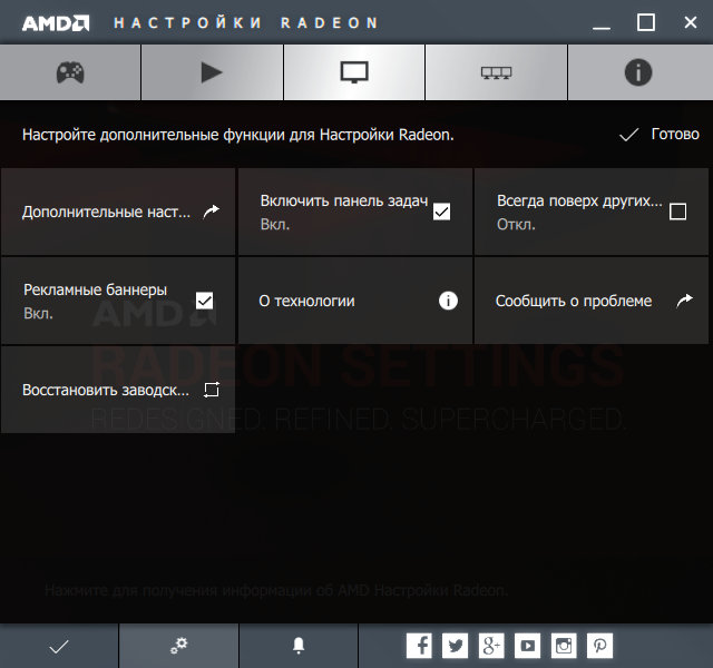 Переходим к настройкам самой утилиты Radeon Settings — тут есть удобная и востребованная возможность восстановления всех настроек по умолчанию, возможность включения значка в трее, связи с компанией AMD, а также некоторые настройки интерфейса, в том числе возможность отлючения рекламных баннеров (вероятно, задел на будущее).
