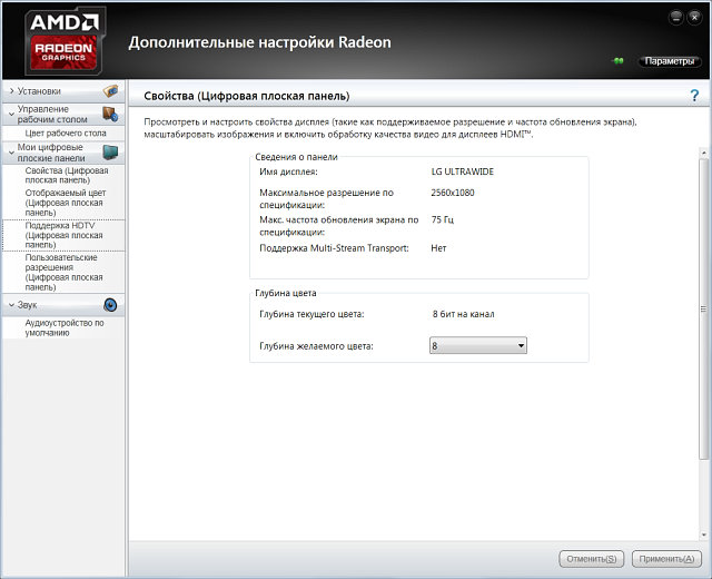 Кнопка дополнительных настроек вызывает отдельное окно с совершенно иным интерфейсом, знакомым нам по предыдущим версиям CCC — тут можно настроить некоторые дополнительные параметры по работе с дисплеями и звуком, которые (пока что?) не вошли в Radeon Settings: