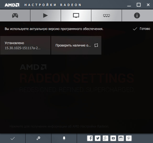 Давайте для начала рассмотрим все страницы новой панели настроек Radeon Settings. Стартовая страница показана на скриншоте выше, а на следующем показана страница проверки обновлений ПО — это сделано довольно удобно, хотя отдельную страницу для обновлений отдавать было не обязательно: