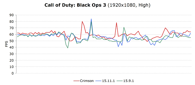 Но не бенчмарками едиными, представителями AMD также отмечаются солидные приросты скорости и в современных играх. К примеру, прирост в средней частоте кадров в игре Call of Duty: Black Ops 3 составляет около 6-8%, в зависимости от разрешения. В данном случае Radeon Software Crimson Edition сравнивается уже с AMD Catalyst 15.10 Beta.