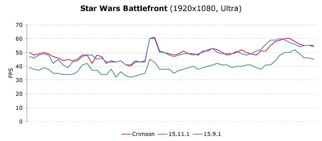 Набор игр для нашего собственного экспресс-теста получился таким: Star Wars Battlefront, Fallout 4 и Call of Duty: Black Ops 3. Для наших измерений мы использовали видеокарту модели Radeon R9 380 и тестовую систему на базе топового процессора Intel под управлением операционной системы Windows 7 SP1, взяли разрешение 1920×1080 и старались выставить максимальные игровые настройки (кроме весьма требовательной Call of Duty: Black Ops 3, где были выставлены настройки уровня High). Посмотрим, получились ли у нас приросты скорости в этих играх?