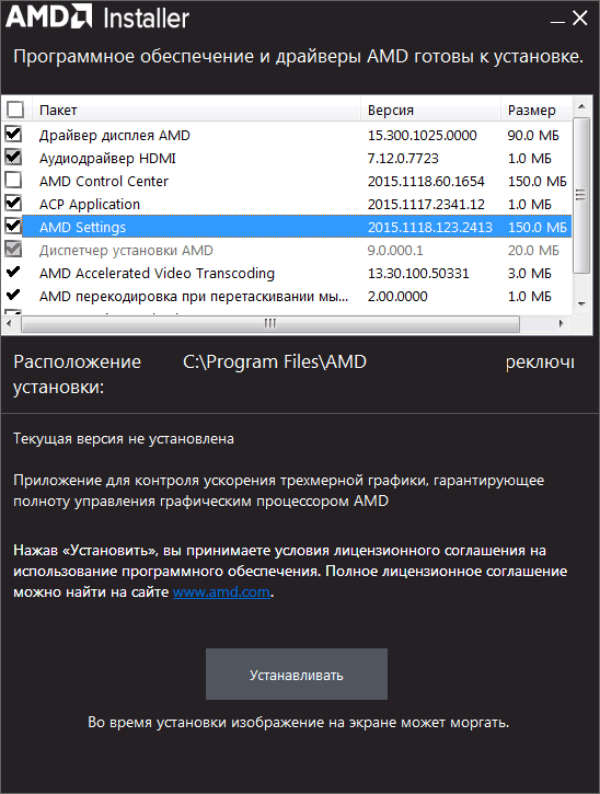 Самое главное в Radeon Software Crimson Edition — полностью переработанный интерфейс настроек и установщика, улучшающие пользовательский опыт при установке, запуске и использовании новой версии ПО. Как театр начинается с вешалки, так и знакомство с любым пакетом драйверов начинается с его установщика. По данным компании AMD, в новой версии время установки сократилось примерно в 1.4-1.5 раза, по сравнению с предыдущим установщиком. Он также получил новый интерфейс — довольно простой и понятный.
