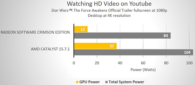 В последнее время весьма важным является вопрос энергоэффективности, особенно для решений компании AMD, которые по этому вопросу явно не среди лидеров. Новый драйвер Radeon Software Crimson Edition включает некоторые оптимизации энергопотребления, в определённых условиях (при просмотре видеороликов и игре в нетребовательные игровые проекты) улучшающие эти показатели для видеокарт Radeon, включая модели Radeon R7 360, R9 380, R9 390 и R9 Fury.