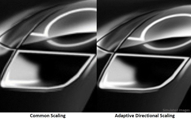 Новая возможность, появившаяся в Crimson Edition — направленное масштабирование (directional scaling), она призвана улучшить плавность линий на гранях в изображении при отображении картинки низкого разрешения на современных дисплеях — при проигрывании видеоданных разрешения 1080p на 4K-мониторах. Говоря по-простому, технология позволяет значительно уменьшить «лесенки» на изображении, получаемые при обычных алгоритмах масштабирования. Проще всего это понять на примере (имитация):