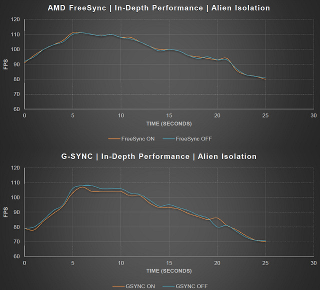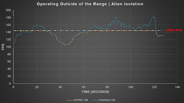 То есть, FreeSync дает пользователю ценную возможность выбора, и иногда отключение вертикальной синхронизации при очень высоких частотах обновления может быть полезным. На графике частоты кадров в игре Alien Isolation это выглядит соответствующе — G-Sync всегда упирается в предел 144 Гц, а FreeSync можно настроить так, что FPS не будет ограничен ни при каких условиях, даже ценой появления визуальных артефактов.