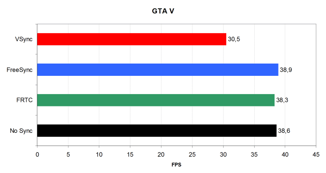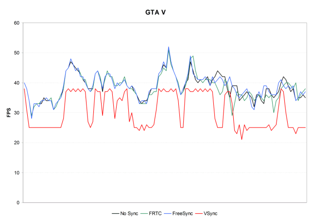 Показатели в режимах FreeSync, FRTC и VSync Off (No Sync) практически не отличаются, так как скорость смены кадров в игре Grand Theft Auto V выше 75 FPS не повышалась. Включение технологии FRTC в этом случае также не могло сказаться на FPS. А вот использование VSync привело к заметному снижению средней частоты кадров, так как в этом режиме используются «ступенчатые» показатели FPS, о которых мы писали выше. Падение средней частоты кадров в этой игре составило около 25%.