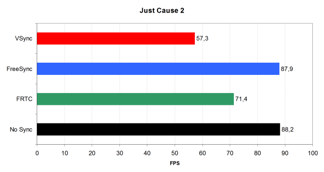 При включении технологии AMD FreeSync, средняя частота кадров снова получилась почти ровно такой же, что была отмечена нами в режиме с отключенной синхронизацией вовсе. Новый режим синхронизации вывода изображения компании AMD обеспечивает отсутствие падения производительности и заметно большую скорость, чем при включенной вертикальной синхронизации. Смотрим на диаграмму средней частоты кадров в игре Just Cause 2: