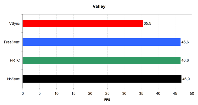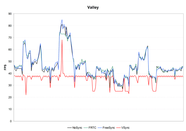 Но самым интересным для нас является тот факт, что в режиме FreeSync средняя частота кадров вовсе не снижается — мы не заметили никаких потерь, среднее значение FPS в этом режиме оказалось даже чуть выше, чем в режиме с отключенной синхронизацией, что можно списать на погрешности при тестировании и усреднении. Рассмотрим бенчмарк Unigine Valley.